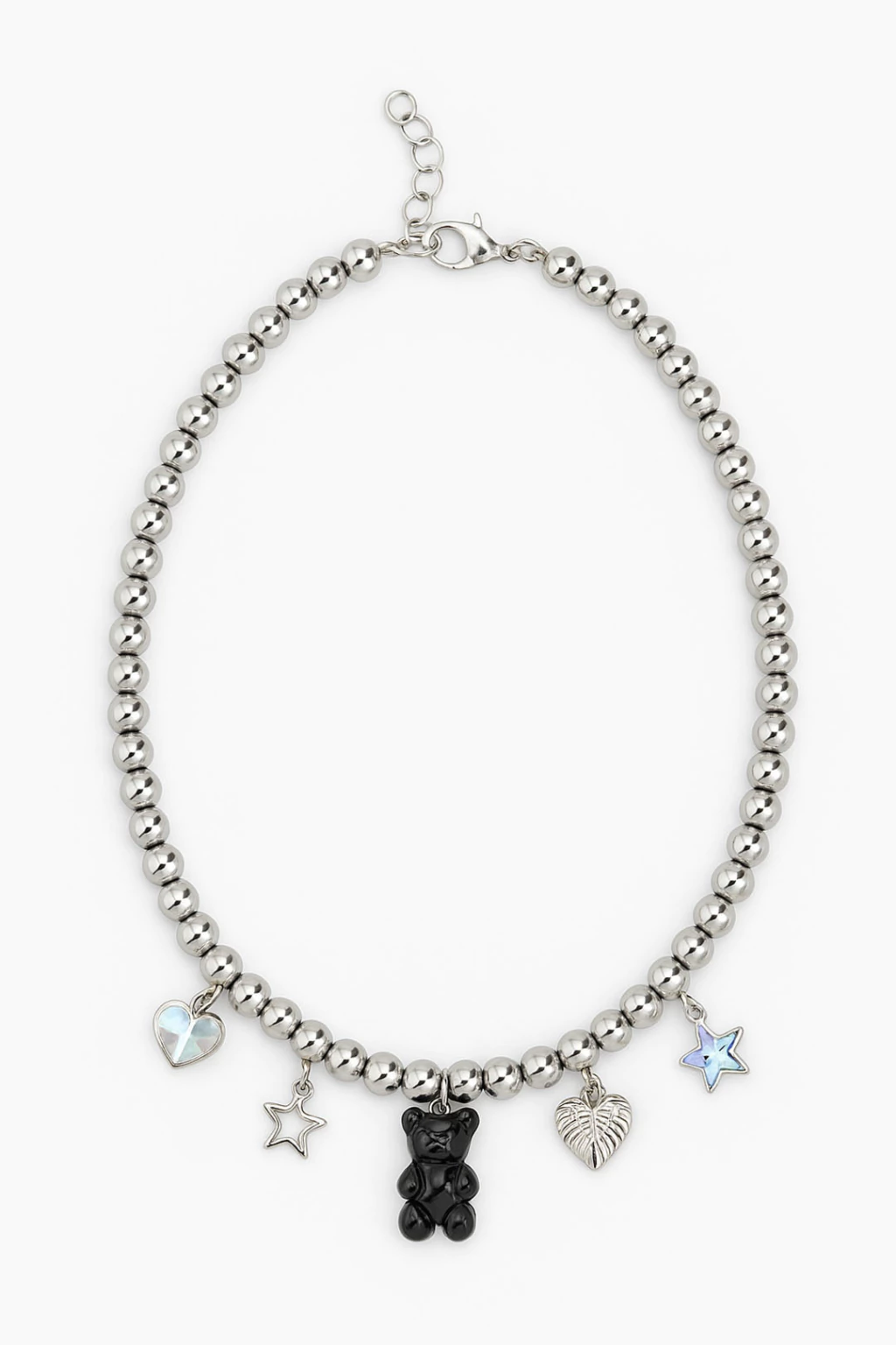 Descubre el encantador Collar Yummi, creado para iluminar el guardarropa de las más pequeñas. Este collar de perlas plateadas se adorna con dijes de oso, corazón y estrellas, aportando un brillo sutil y elegante.