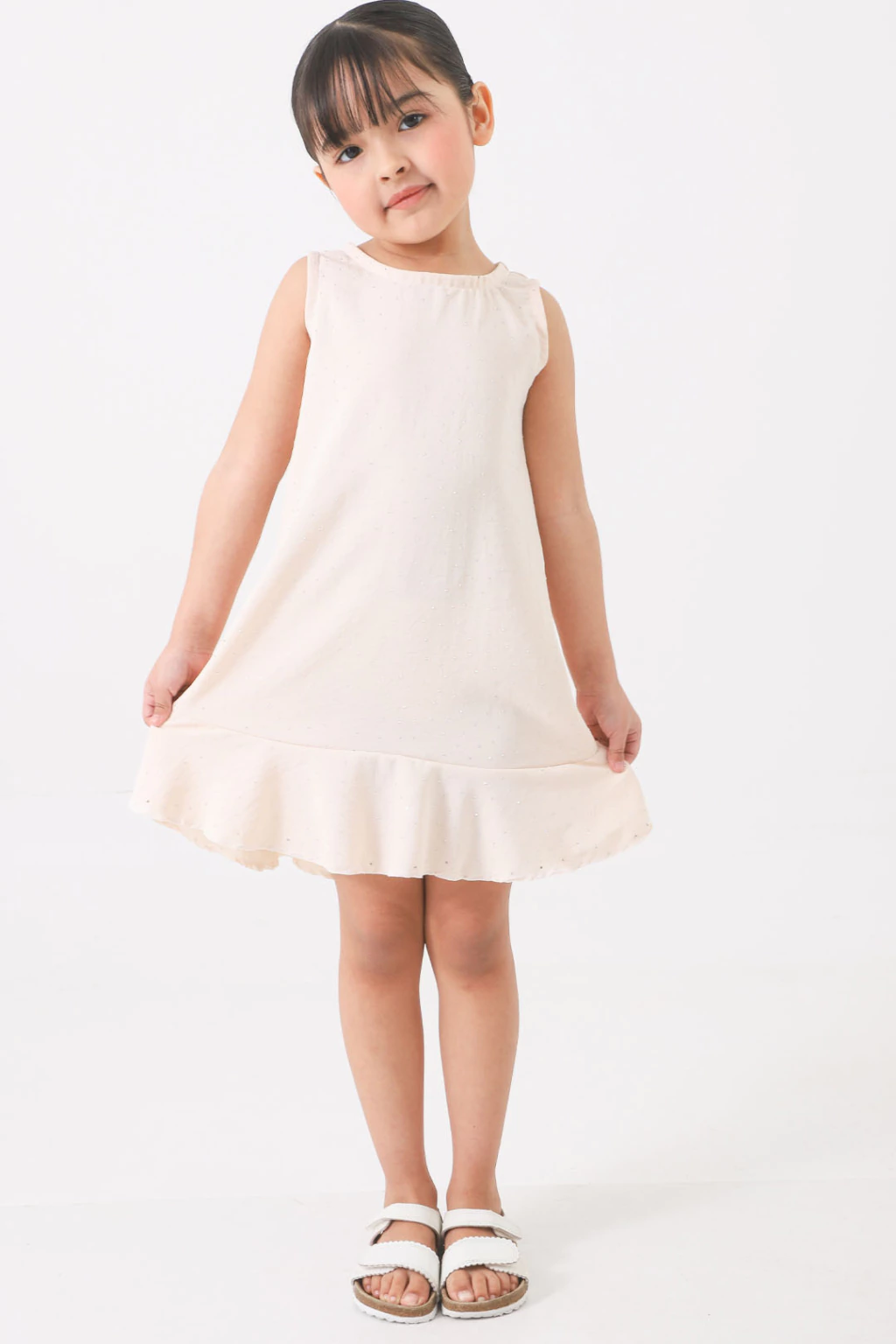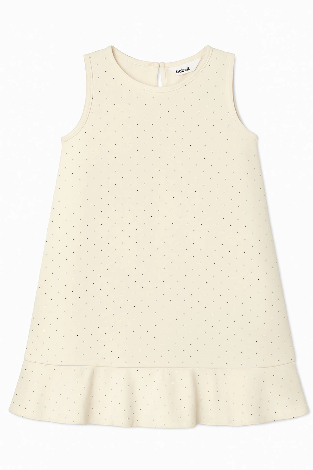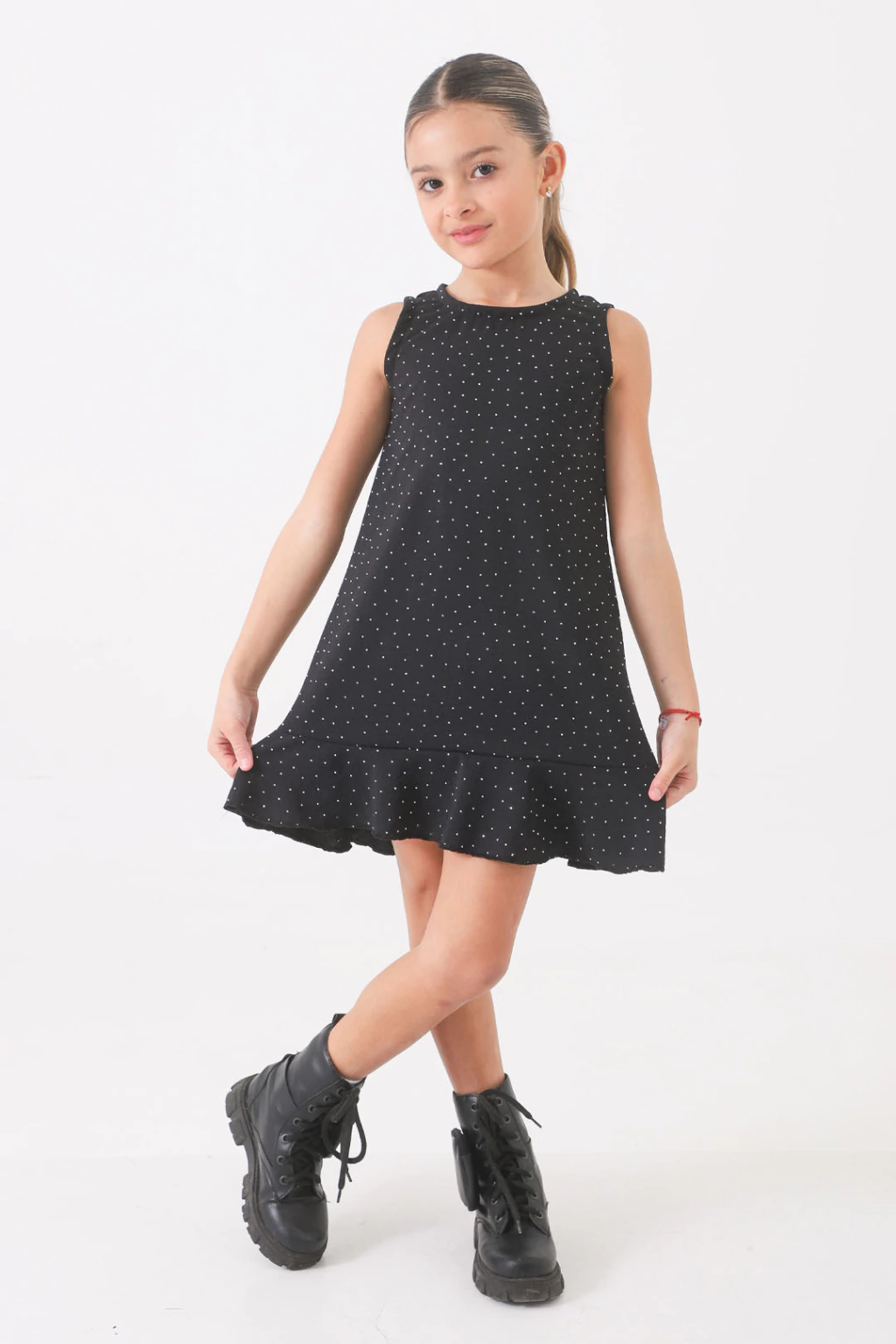 Este vestido corto con brillos es ideal para que las más pequeñas luzcan cómodas y cancheras. Cuenta con un escote tipo musculosa y un corte en A que, junto al volado en el ruedo, le da un toque divertido y fresco.